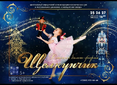 🗎 [600 ₽] — Центральный офицерский клуб ВКС и фестивальное движение «Сияющий мир звезд» 25, 26, 27 декабря 2025г. в 14.00 приглашают Вас на великолепное семейное представление – детский балет «Щелкунчик»! Это не просто спектакль, а захватывающее путешествие в мир чудес, музыки и волшебства. На сцене оживет трогательная история о смелой Марии, ее таинственном подарке – Щелкунчике и сказочном приключении в царстве грез. Этот спектакль объединяет профессиональных артистов балета и юных талантов, чей яркий танец и мастерство наполнят классическую постановку новыми красками. Вместе они создадут поистине завораживающее зрелище, которое оставит в сердцах зрителей тепло, восторг и искреннюю радость. Погрузитесь в атмосферу волшебства вместе с нами! Восхитительная музыка Петра Ильича Чайковского, изысканная хореография и ослепительная игра света и декораций соткут настоящее чудо, где музыка и танец сливаются в магию. Не упустите шанс прикоснуться к сказке! Ждем Вас на незабываемом балете «Щелкунчик»! В праздничном фойе Дед Мороз, Снегурочка и сказочные герои проведут новогодний интерактив. Интерактивная программа начнется в фойе с 13:00 до 13:30. Это отличная возможность погрузиться в атмосферу праздника, пообщаться и насладиться увлекательными активностями! Спектакль состоится в концертном зале с 14:00 до 15:20. Не пропустите шанс увидеть яркое и запоминающееся представление, которое подарит вам незабываемые эмоции! Обратите внимание: подарок на мероприятие приобретается отдельно.