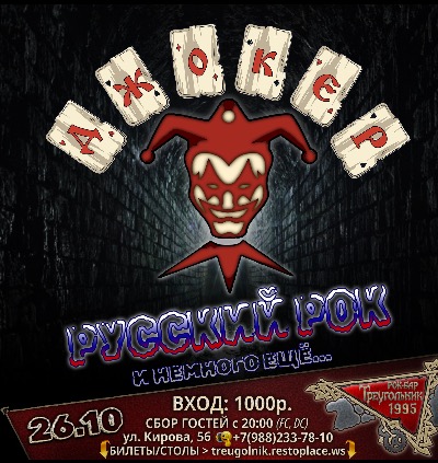 [1000 ₽] 🗎 Приглашаем в Рок-бар Треугольник, чтобы отлично провести время, вместе с группой Джокер! Программа концерта: «Русский рок и немного ещё!». Споём..